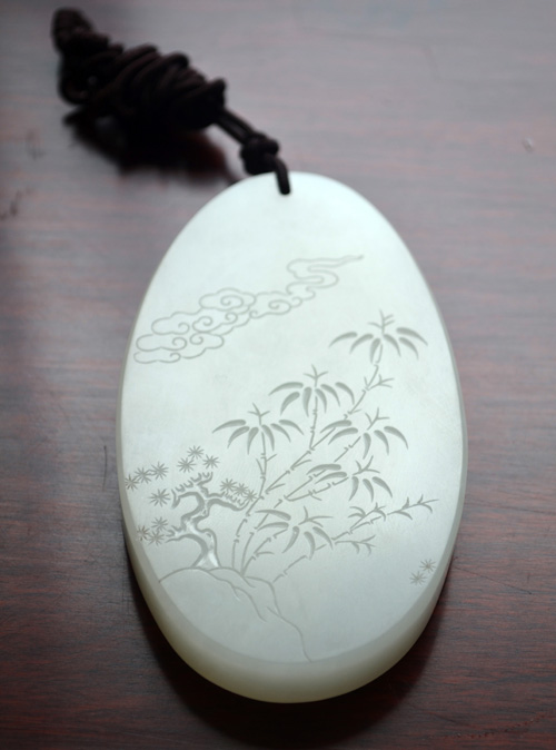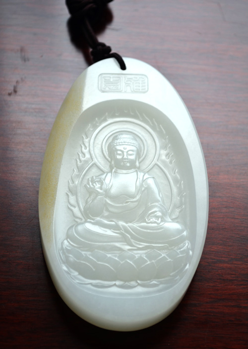 佛教自印度传入中国,已有二千多年的历史,为我国广大佛教徒信仰和尊崇。此后,民间多用不同材质、方式来体现释迦牟尼佛的形象。而此牌便是如此,作品选用白玉精致而成,玉质细腻温润,洁白如脂。牌形为椭圆形,大气厚重,正面图案:释迦牟尼,静坐莲花宝座之上,螺发头饰,大耳垂肩,面形丰满圆润,神态沉静安详,身后饰圆形火焰形头光和背光。左手置于腿上,右手上抬呈兰花翘状,身着僧裙,衣纹自然流畅。背面以纯熟技法浅阴雕松竹,附以连接在一起的云纹装饰,寥寥数刀,刻画简练,飘渺灵动,更显作品意境。牌眉左侧巧妙留皮,正面眉头题款:雅园。