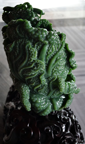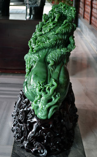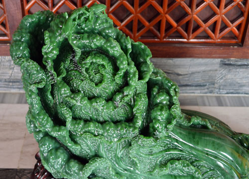 陈列于神圣玉雕大师园玉展厅的这颗大白菜,则是难得一见的俄罗斯碧玉白菜。碧玉,通常色泽艳丽,有着宝石光泽而备受人们喜爱,大多人们都会选择制作手镯或牌子等销量好又出手快的小物件,便于流通和佩带。对于摆件这种费料费时费工的物件,很少有人选择便显的稀有少见,弥足珍贵。