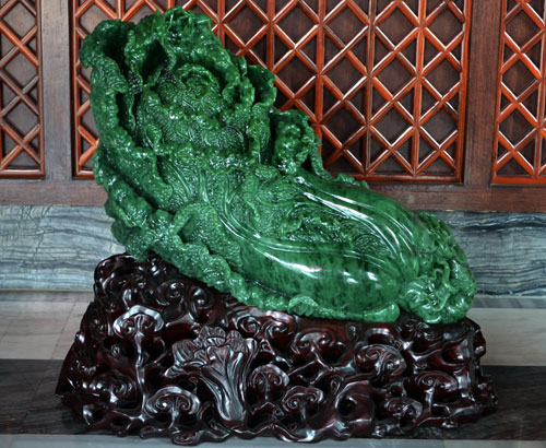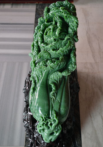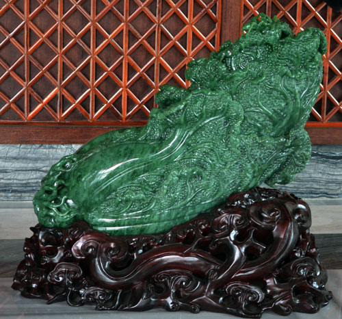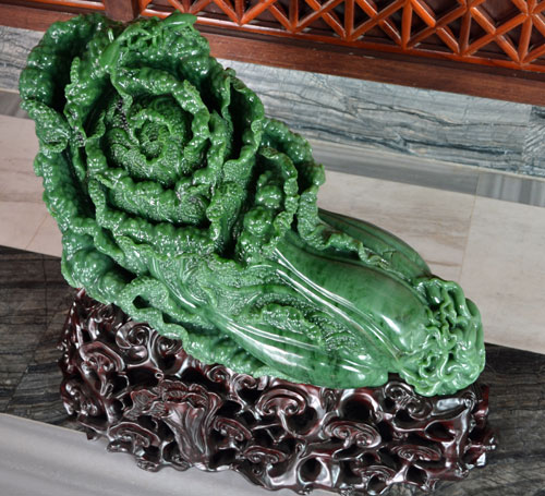 其用料和形态都堪称一绝。这棵白菜所用的玉料细腻温润、色泽可人,工匠又根据原料,因材施艺,据色拟形,雕琢一颗出枝叶肥厚,层次分明的大白菜,叶子脉络清晰、灵活生动、栩栩如生。观之,仿佛觉得一股欣欣向荣的生命力呼之欲出,宛如真物再现。在嫩绿的菜叶上仍旧趴着两只蟋蟀,更增添了作品的情趣,动静相宜,十分流畅自如。迎合了中国人传统的多子多孙的美好愿望。白菜寓意“百财”,取白菜的谐音,意为“百财”,有聚财、招财、发财、百财聚来的含意,拥有“白菜”(佰财)财富即到。整件作品寓意拥有者将财源广进,连连不断。
