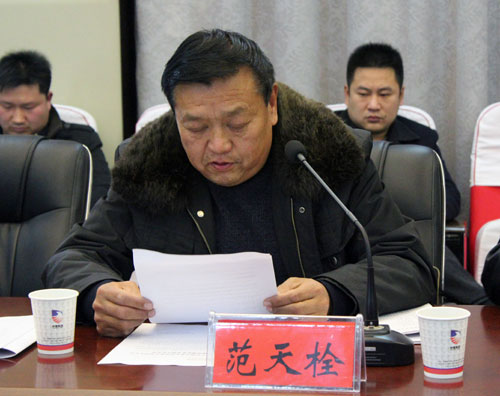 县宝协常务副会长范天栓宣读《镇平县宝玉石协会第五届理事会第四次会议建议增补副会长、常务副会长名单》