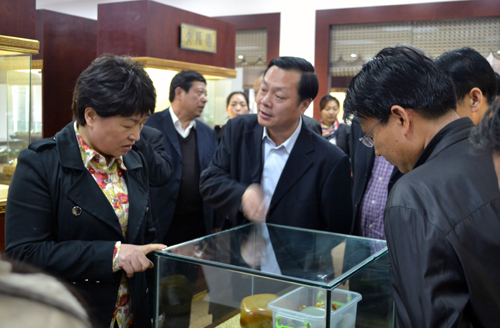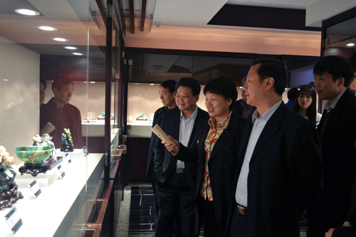 南阳市人大常委会副主任庞震凤(左一)带领市人大常委会视察组,和南阳市人民政府副市长和学民(左三)参观玉神圣工艺玉展厅