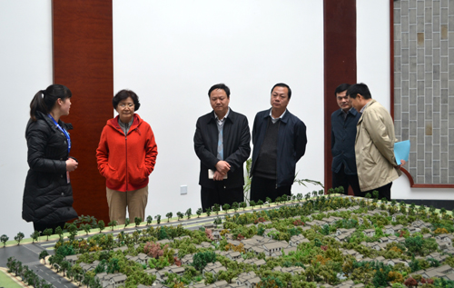 省文化厅厅长杨丽萍(左二),南阳市副市长和学民(右三)以及镇平县副县长李显庆(左三)参观大师园规划沙盘