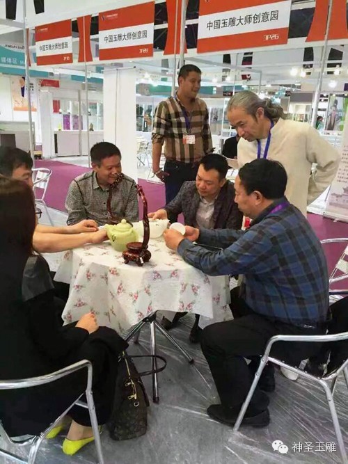 北京博观国际拍卖有限公司董事长奥岩先生在神鹰集团董事长李杰先生、神圣工艺总经理李松盈先生陪同下观看大师园团队展品