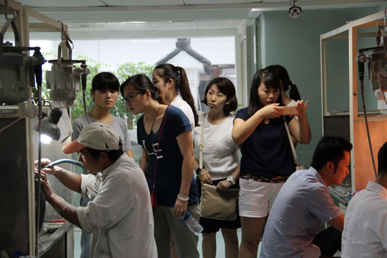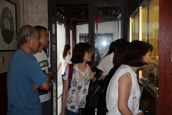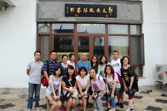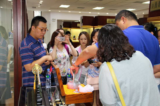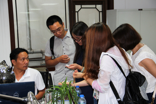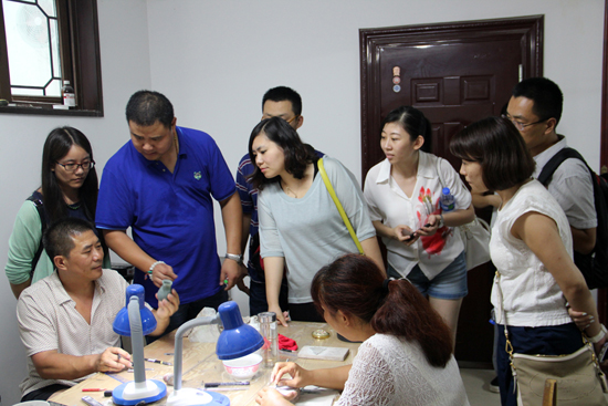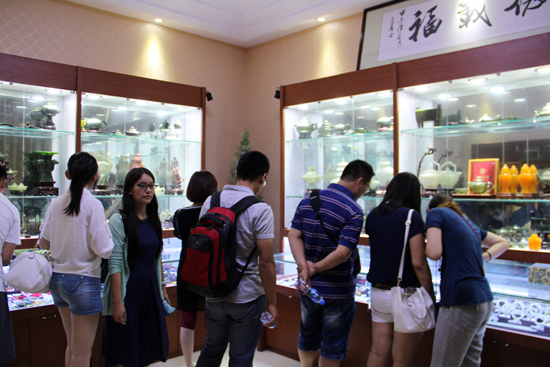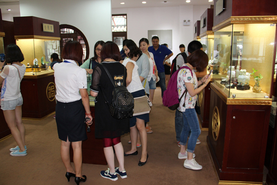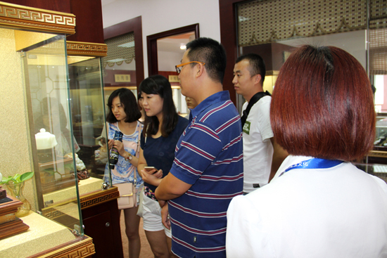 北京高等珠宝研修学院组织周大福员工考察南阳玉石市场,由该院韩冬老师和徐晓红老师带队。2015年8月18日下午,到达第一站——镇平玉雕大师创意园。本次学习之旅共带领全国各地周大福精英员工共计15名,其中的员工皆是珠宝玉石的从业人员与爱好者,对玉器鉴定鉴别以及市场营销与商贸知识有着浓厚的学习兴趣。