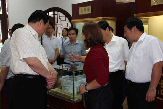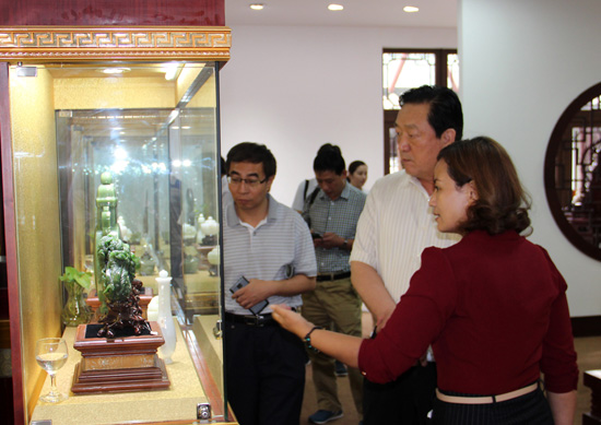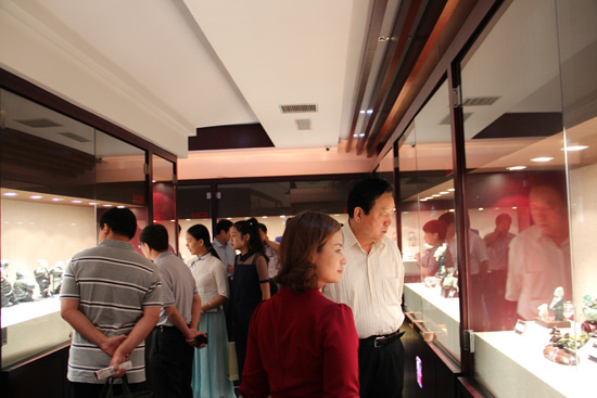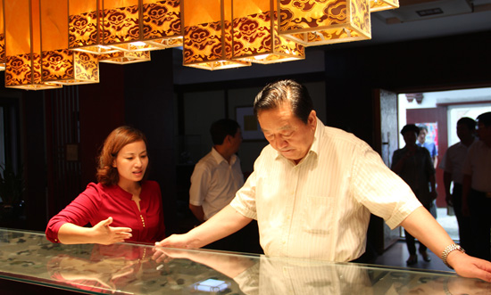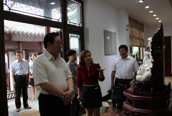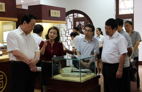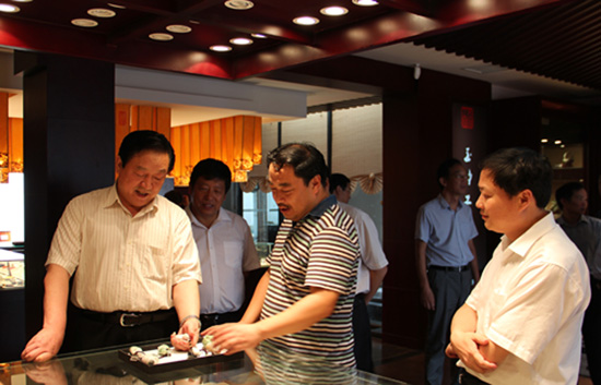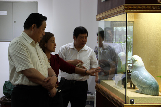 宋主任及领导认真观看神圣玉雕精品馆陈列的精品