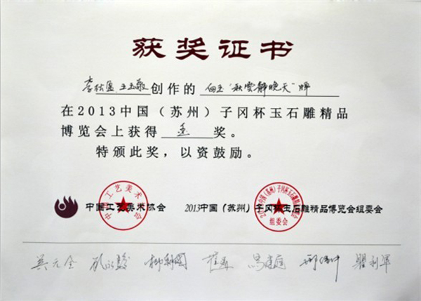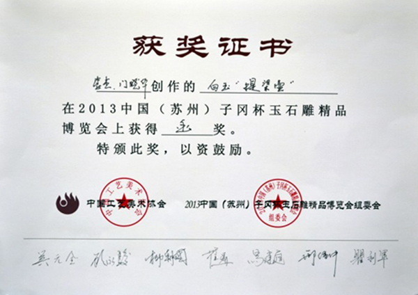 2013中国(苏州)子冈杯玉石雕精品博览会由苏州市人民政府、中国工艺美术协会主办,苏州市经济和信息化委员会、苏州市工艺美术行业协会、呈辉(中国)集团有限公司承办,苏州市工艺美术学会、苏州市玉石文化行业协会、苏州工艺美术博物馆协办。为期十天的评展活动于9月21日在位于苏州光福的中国工艺文化城圆满结束。
